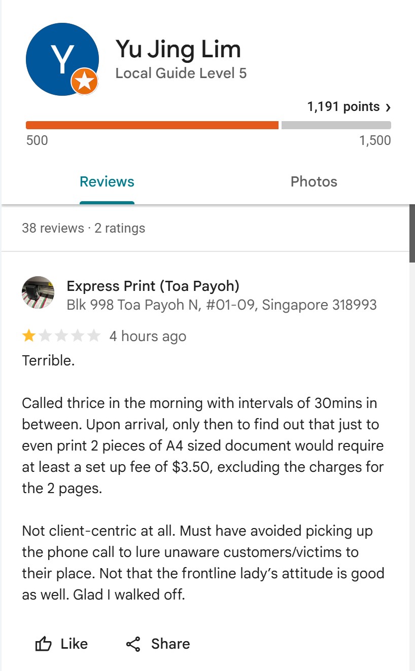 2. “Upon arrival, only then to find out that just to even print 2 pieces of A4 sized document would require at least a set up fee of $3.50, excluding the charges for the 2 pages.”