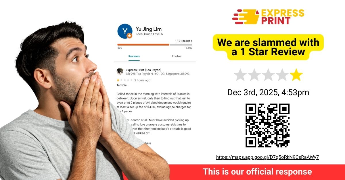 Today (03 Dec 2025), we received an unmerited 1-star review on our Google page from a user named Yu Jing Lim (see review here). Reviews like this can have a serious impact on our reputation, especially when the claims made are not true. In the interest of full transparency, we are sharing both the review and our response publicly.