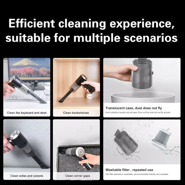 The handheld vacuum cleaner suitable for inside of your car, living room, bedroom,bathroom,office,storage room,Stairs, kitchen, hard to reach corners, wall edges,ect…