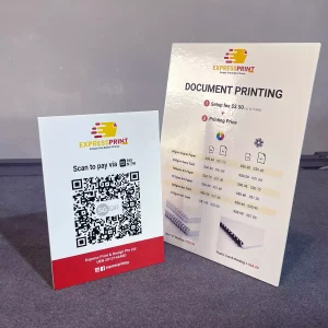 Printing [?]: This product will be printed in 4C (CMYK) and mounted on a 5mm foam board. A seperate butterfly stand made from 1mm thick white cardboard will then be sticked at the back of the foam board, making it a stand when flipped opened.
